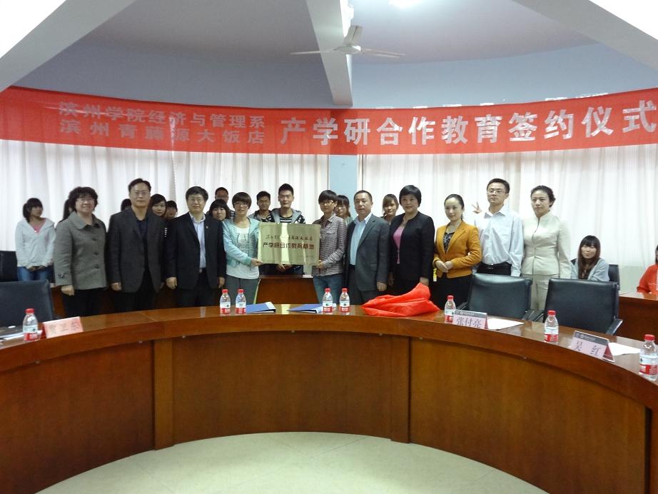 最后,双方在友好融洽的氛围中签署了滨州学院经济与管理系与滨州青藤源大饭店的产学研合作教育协议,系党总支贾卫东和吴红总经理为校企合作产学研合作教育基地揭牌。