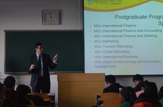 首先,周鑫处长代表学校对英国亚伯大学代表团的到来表示热烈欢迎。随后Steven教授做了题为“区域经济发展研究”的精彩报告,介绍了亚伯大学商学院的专业、招生录取以及亚伯大学学生语言中心的情况。最后就同学们关心的留学问题进行了面对面的交流。