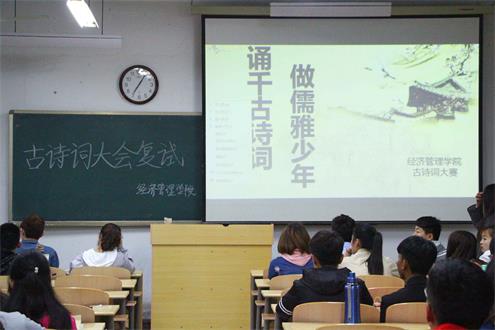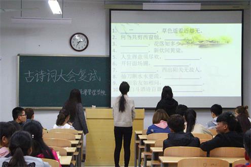4月13日晚,中国·ok138太阳集团在7号教学楼204室举行古诗词大会选拔赛,中国·ok138太阳集团社团部副部长傅桐光、蒋明露等人担任评委,现场近60人。