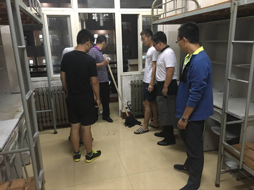 活动伊始,各个宿舍的成员带着卫生工具到达分配的宿舍进行卫生大扫除。首先由各个宿舍舍长将打扫任务分配到个人,擦桌、擦玻璃、扫地、拖地、刷厕所等等。正是由于宿舍成员之间分工明确,并且每位同学都带着对新生的期待,半个小时后,所有宿舍打扫完毕。接着,何秀国书记和王泰宁老师对宿舍打扫情况进行表扬和指导,不放过任何一个死角,同学们认真听取意见,团结协作,为新生创造了良好的宿舍环境。