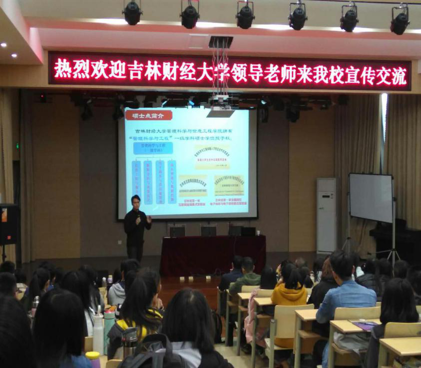 郭新伟院长对姜建华博士一行的到来表示热烈欢迎,介绍了学校和经管学院的办学历史、办学特色、考研工作等方面的基本情况。姜院长介绍了吉林财经大学的基本情况,吉林财经大学是吉林省重点大学,吉林省人民政府与国家税务总局共同建设高校。重点介绍了管理科学与信息工程学院拥有管理科学与工程一级学科硕士学位授予权,下设信息工程与服务管理、数据分析与决策优化、电子商务与供应链管理、商务智能与数据挖掘四个专业,同时对图书情报专业硕士学位的基本情况做了介绍。姜院长展示了吉林财经大学良好科研环境、创新人才培养方式、国际交流合作及校企合作人才培养实践基地建设等内容,分析了研究生招考政策和分享了学院研究生就业方向和岗位。最后,姜院长结合自身实践经验和学院研究成果,详细解答了每一位同学的提问,同学们纷纷表示受益匪浅。