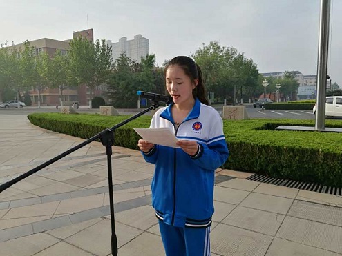 早上6:50分,待全体参与人员就位之后,主持人宣布升旗仪式正式开始。国旗班的旗手们着装整齐,迈着矫健的步伐,护送着鲜艳的五星红旗入场举行升旗仪式。伴着《义勇军进行曲》的响起,全体师生唱国歌、行注目礼,注视着五星红旗冉冉升起。随后,学生代表嵇惠园在国旗下进行“不忘初心跟党走,青春建功新时代”主题宣讲,号召同学们不忘初心、牢记使命,顽强拼搏、奋勇担当,书写无愧于历史和时代的青春篇章!最后,主持人带领全体学生在国旗下进行庄严宣誓。