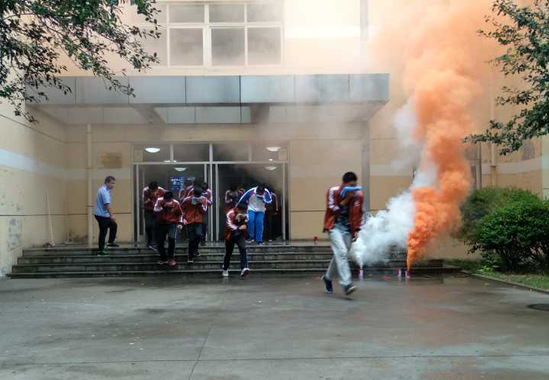 活动伊始,由主持人宣读此次活动的主要内容及注意事项。随后,以生动实例为2018级新生进行消防安全知识培训,并就如何佩戴呼吸面具、使用灭火器、如何进行灭火逃生等环节进行了讲解。之后,参加消防灭火演练的2018级新生在消防战士的指导下进行了消防灭火、逃生实战演练。宿舍楼放置的烟雾弹发出滚滚烟雾,保卫处负责人及公寓管理人员立即组织同学用湿毛巾捂住口鼻,快速、有序从逃生口撤离到安全地点。滨州市消防支队的消防车到达现场,多条水龙立刻喷向“着火点”,“火情”得到控制。消防人员搭起拉梯,设置逃生绳索,并迅速启动登高车对高层被困学生进行救助。经过全体人员奋战,“大火”最终被扑灭。