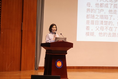 活动伊始,主持人介绍了本次活动的评委老师及比赛规则。此次活动按照抽签顺序进行,各位选手依次讲述自己推荐的书目,其中不乏中外名著《平凡的世界》、《骆驼祥子》、《小王子》等经典读物。我院参赛选手唐丹丹以一首《时间都去哪了》引出了父母与子女间感情的深切及奇妙,歌曲中所唱柴米油盐半辈子,转眼就剩下满脸的皱纹了引起了观众对亲情的感慨共鸣。在悠长动人的音乐伴奏下,唐丹丹缓缓引出她所推荐的书目《目送》,并声情并茂的讲述了龙应台在兼顾事业,照顾子女的同时,又细致入微的孝顺父母的动人故事。舞台上灯光耀眼,观众席全神贯注,她的讲述让大家深深体会到父女母子之间的缘分,是将你和他手上系了一根线,他的渐行渐远不能拉动你,却有了一丝痛楚,是牵挂,是回忆,是生的意义。同学在聆听时陷入沉思,随后掌声四起。最后,唐丹丹以其出色的表现获得了二等奖。