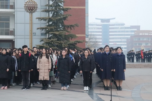 6时50分,待全体人员就位后,主持人宣布升旗仪式开始。国旗班的旗手迈着矫健而整齐的步伐,护送着鲜艳的五星红旗入场。伴着《义勇军进行曲》的响起,全体师生唱国歌、行注目礼,注视着五星红旗冉冉升起。随后,学生代表在国旗下作主旨演讲,号召同学们在新的学期能以崭新的姿态、满腔的热忱、饱满的精神投入到新的工作和学习中,顽强拼搏、奋勇担当,书写无愧于历史和时代的青春篇章!最后,学生工作部部长贾卫东讲话,他号召广大青年学生要坚定理想信念,用习近平新时代中国特色社会主义思想引领前进的方向;要勇担使命,用实现中华民族伟大复兴中国梦的时代主题书写奋斗的青春;要甘于奉献,用新时代奋斗者的价值追求让青春焕发绚丽光彩;要严于律己,用社会主义核心价值观的道德坚守成就精彩的人生。