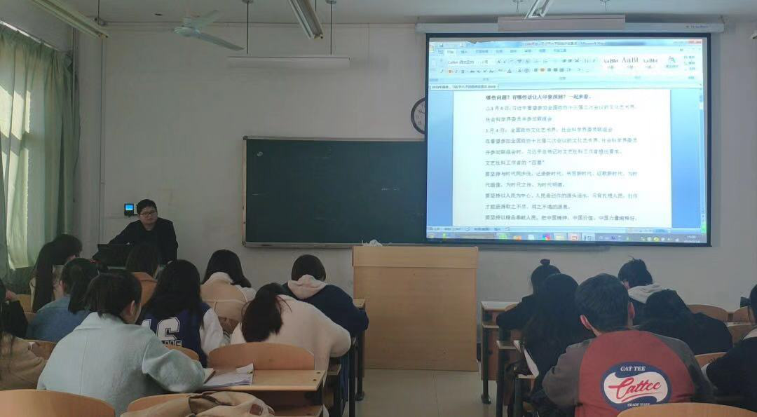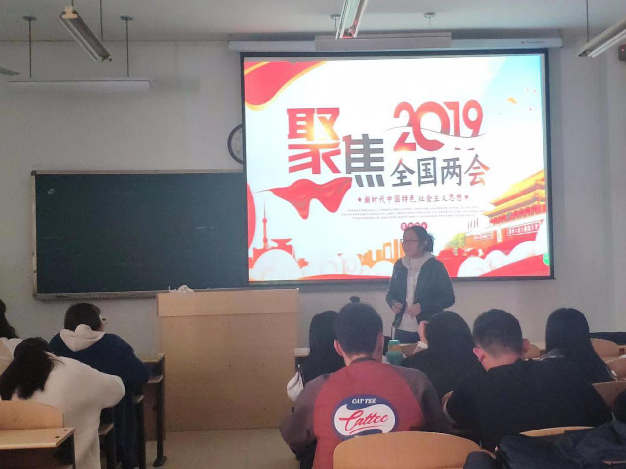 本次学习活动分为三个阶段。首先,由宣传委员王贝贝带领大家学习了《习近平在中央党校中青年干部培训班开班式上发表重要讲话》,通过原原本本、逐字逐句的诵读,使支部成员对讲话精神有了全面的认识和理解。随后,组织委员王胜通过PPT的形式,讲解了两会期间习近平总书记六下团组讲话重点,对文艺社科工作者的“四要”、生态文明建设的“四个一”和“四要”、脱贫攻坚的“五要”等内容进行重点解说。最后,支部书记张璐带领大家共同学习了《2019年政府工作报告》,并对本次学习活动进行总结。她要求同学们利用好“学习强国”平台,加深政治理论知识学习,将学习成果贯彻落实到平日的学习和工作中,不断奋进。