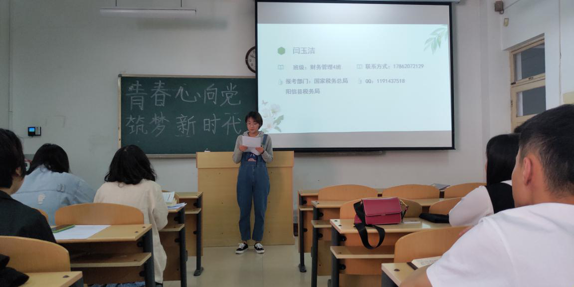 随后,学生党员闫玉洁、王雅涛、徐璐、尹蕾为大家分享了自己考公、考研的成功经验和个人成长历程,从选择合适的目标、养成坚持的习惯、做好学习规划等方面分享了自己的经历和心得,并给支部党员同学学习、生活等方面提了可行的建议,鼓励党员同学们要树立信心,勇于坚持,为理想奋斗拼搏。
