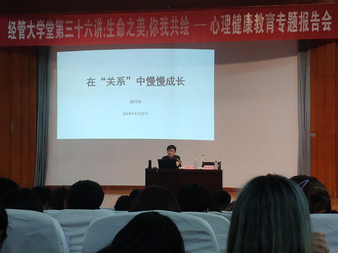 报告会上,康老师以“在‘关系'中慢慢成长”为题,结合实际案例和多年工作经验,通过人际关系的概念、大学生人际交往的基本特点及常见问题、如何营造良好的人际关系等方面内容向同学们介绍了在学习生活中如何进行正确的自我认知、如何同其他同学和睦相处,构建起和谐的人际关系。接着,康老师就“女生如何保护自己”、“恋爱问题”、“作为女大学生怎样培养自己”三个方面对在场女生进行心理健康教育,让女生学会自尊、自爱、自强、自立、自重。最后,康老师同现场同学们进行了互动交流,对于同学们的提问给予了生动、细致的回答。同学们纷纷表示,通过本次报告会,学到了很多心理健康的知识,康老师提出的一些建议和方法,生动而具体,在内心深处受益匪浅。