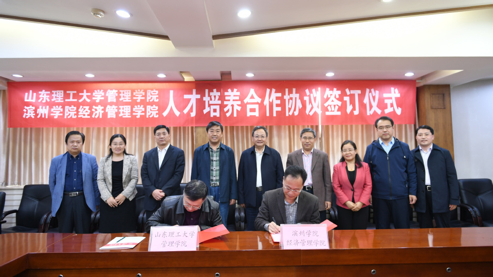 10月24日,我院与山东理工大学管理学院人才培养合作协议签订仪式在办公楼南楼210会议室举行。山东理工大学党委常委、副校长王立斌,我校党委委员、副校长李伟年,山东理工大学管理学院党总支书记高厚礼,院长程钧谟,副院长闫秀霞、孙秀梅,我院党总支书记崔玉海,院长郭新伟,副院长王春晖、周江涛出席仪式,研究生处处长闫永利主持。