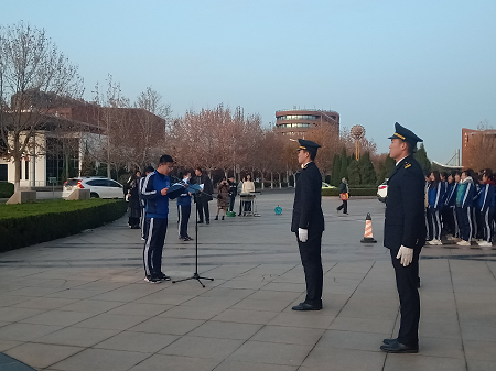 早上6:30分,待全体参与人员就位,一切准备就绪之后,主持人宣布升旗仪式正式开始。国旗班的旗手们着装整齐,迈着矫健而整齐的步伐,护送着鲜艳的五星红旗入场。伴随着《义勇军进行曲》,五星红旗冉冉升起,迎风飘扬。在场的每一个人向国旗行注目礼,深怀对祖国无限的热爱和崇高的敬意。随后,学生代表王京廷同学进行“我与祖国共奋进”国旗下的演讲,作为青年大学生要牢记初心,勇于担当,敢于有梦、勇于追梦、勤于圆梦,释放青春能量,点燃青春梦想,在为实现中华民族伟大复兴的奋斗中实现人生价值!最后,主持人带领全体学生在国旗下重温入团誓词,庄严宣誓。