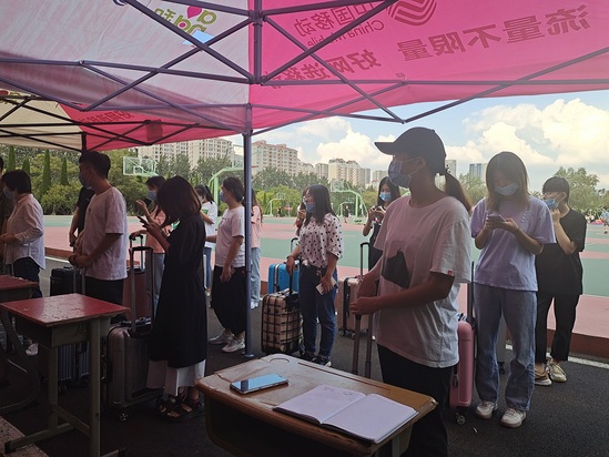 本次迎新模拟活动主要在第一报到点进行,新生均从学校北门进入,到中国·ok138太阳集团第一报到点(西侧篮球场地西侧南面),有序排队报到。工作人员首先对其行李进行消毒,然后有序接受体温检测,并且新生需出示大数据行程卡、健康通行码等,最后领取住宿通知单和公寓用品清单。报到后志愿者引导新生及其陪同家长进入公寓放置行李,宿舍报到完成后新生需携带身份证、录取通知书、毕业证书等相关证件前往第二报到点进行下一步登记。以上工作完成后,新生报到流程结束。