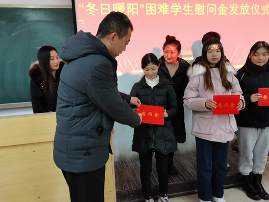 仪式上,在热烈的掌声中,我院四名家庭困难、品学兼优的学生领到了人均1000元的慰问金,使他们在这个寒冷的冬天里,感受到学校、学院大家庭的温暖,也更加坚定了他们发奋学习、努力完成学业的信心。随后,学生科长张智涛语重心长地对受助同学们说到,学校和学院时刻关心困难学生的生活与学习,为了帮助贫困生健康成长、完成学业,学校每年都会拿出专门资金来帮扶资助贫困生,同学们要体会学校的良苦用心,同时希望受助的同学们一要学会感恩,体会学校的温暖,增强爱国爱校的意识,珍惜在学校的学习机会,学好知识,提升本领,奋力拼搏,用行动提升自己,通过自身不懈的努力改变命运。四名受助同学也纷纷表示,感谢学校和老师们热切的关怀,心中倍感温暖与感动,在今后的学习生活中,定会奋力前行,不断努力,做到无愧于学校、无愧于青春,成为一个有价值的人、有益于社会的人。