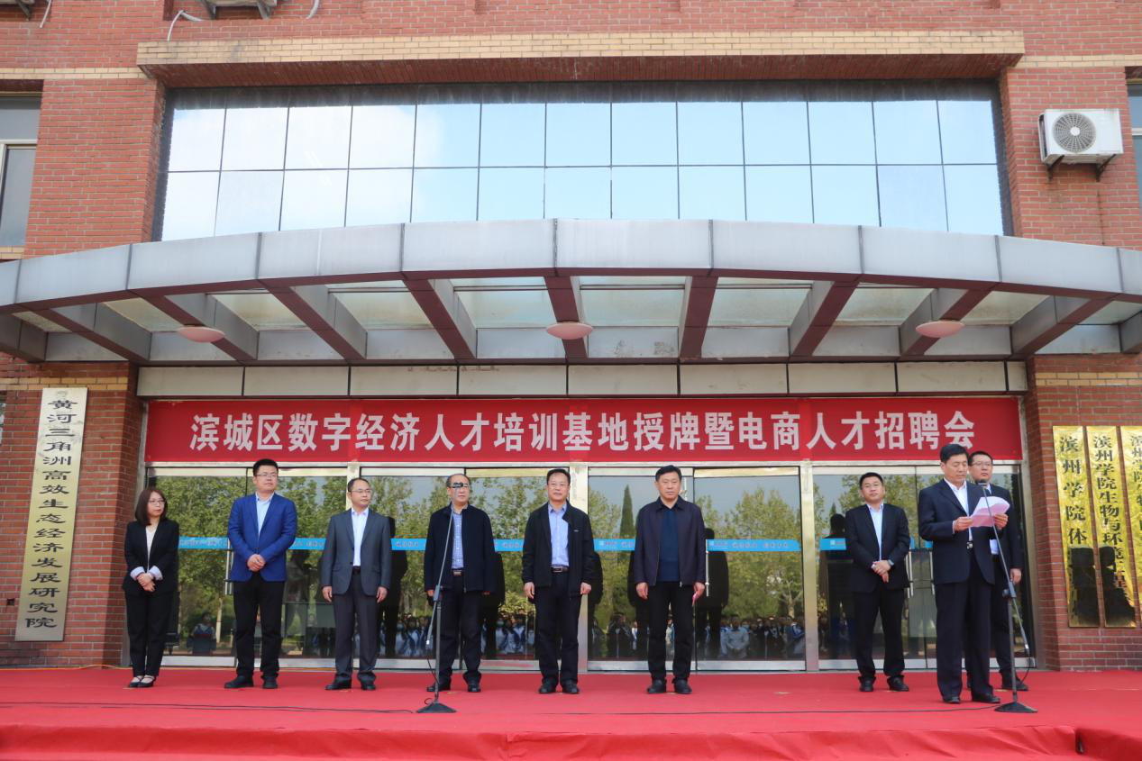 为引导和鼓励经济管理学院毕业生积极投身“双型”城市和“富强滨州”建设,聚焦企业数智化变革带来的人才与创新的需求,实现人才培养与企业需求的无缝对接,4月24日上午,中国·ok138太阳集团于实验楼前举办滨城区数字经济人才培训基地揭牌仪式暨电商人才招聘会。滨州学院党委委员、副校长郭新伟,滨城区副区长朱庆林,街道党工委副书记、办事处主任宫承祥,滨州学院招生就业处处长张文军,滨州学院中国·ok138太阳集团党总支书记崔玉海,滨州学院中国·ok138太阳集团党总支副书记何秀国等领导,滨城区、彭李街道等相关负责人,部分滨州知名电商企业家,经济管理学院全体辅导员及应届毕业生参加了活动。本次活动由中国·ok138太阳集团党总支书记崔玉海主持。
