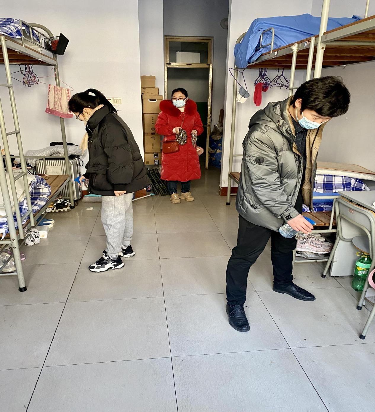 为保证通风消毒工作顺利进行,辅导员老师们提前联系公寓楼管领取房间钥匙并且准备好消毒液、喷壶等消毒工具。随后在于峰书记和张智涛科长的带领下,各年级辅导员分为3组有序地为1号、4号、10号公寓楼的相关学生宿舍进行了全面通风消毒。辅导员进入宿舍后先打开窗户为房间通风,之后仔细地对地面、墙根、厕所、阳台等角落进行消毒,待消毒通风结束后及时锁好门窗。