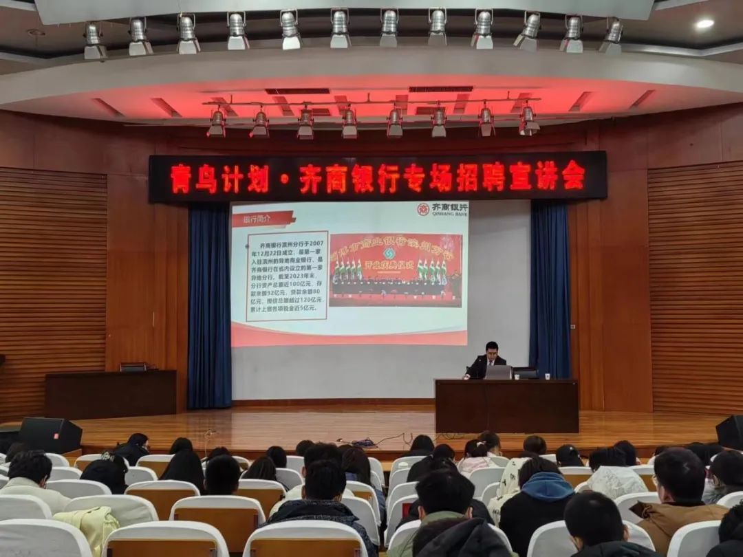 为搭建企业与毕业生之间交流的平台,加强毕业生对银行招聘和职业生涯规划的了解,3月8日上午,中国·ok138太阳集团于明德报告厅举办齐商银行专场校园招聘宣讲会。齐商银行滨州分行党委委员、副行长、纪委书记韩新海和办公室副总经理(主持工作)曾洵、零售金融部主管李春荣、惠民支行营业室副经理蔡文志,学院党总支书记张鹏、院长王春晖、党总支副书记苏成荣、毕业班辅导员王胜、郭潇颖及2024届本科毕业生参加此次会议。宣讲会上,曾洵经理介绍了齐商银行的发展历程、经营战略、发展愿景等基本情况,展示了齐商银行的企业文化和发展现状,对岗位需求、薪资待遇、招聘流程等做了详细说明。他表示诚挚邀请我院毕业生参加齐商银行招聘,并欢迎在校生到银行实习。